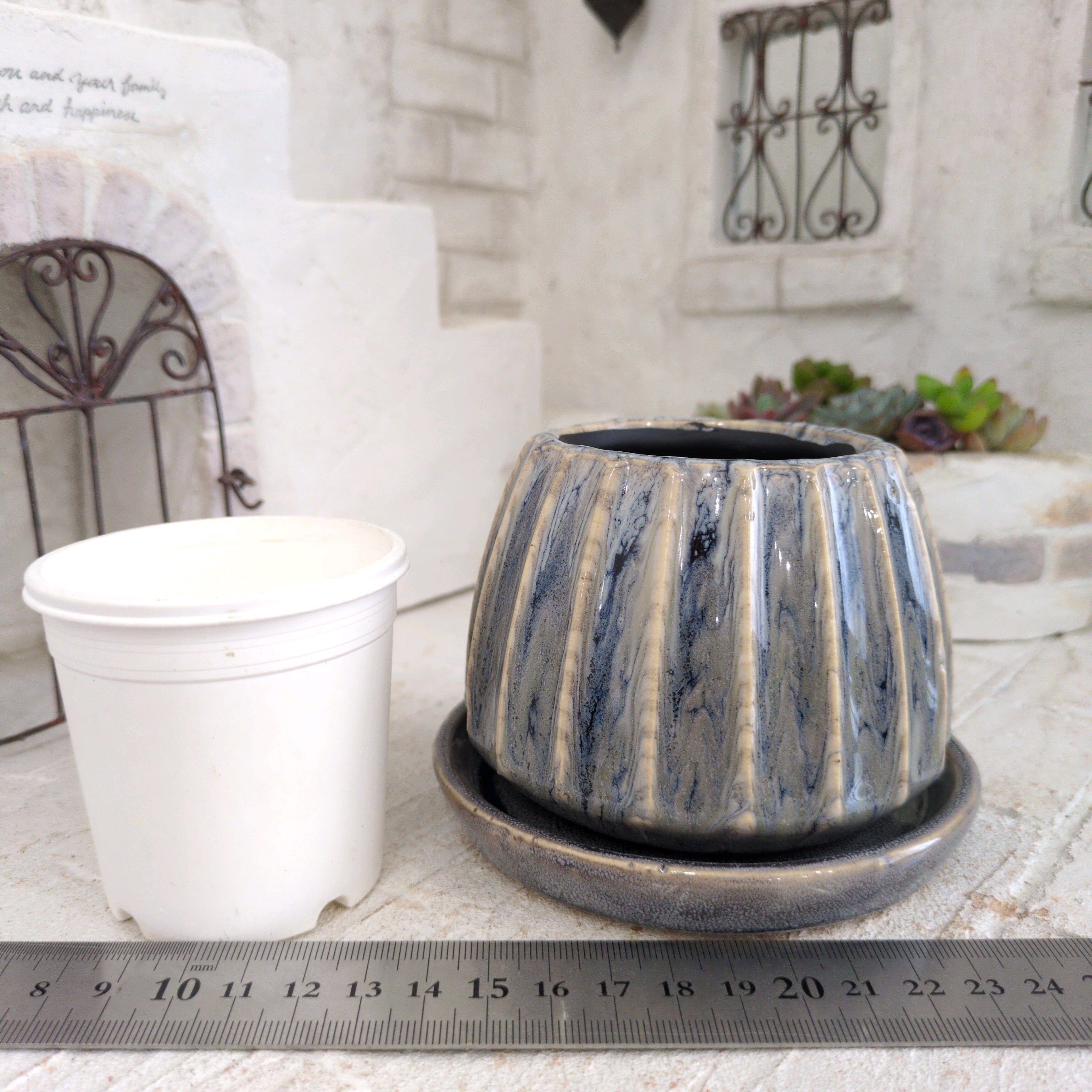 雑貨 植木鉢 和風受皿付き・ブルー系